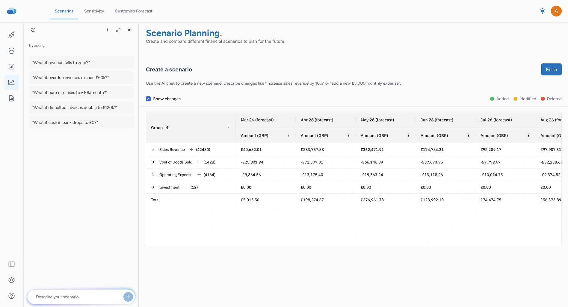 Walk through CloudFO’s scenario workflow with screenshots that explain creation, review, and forecast comparison without simulating the whole product.